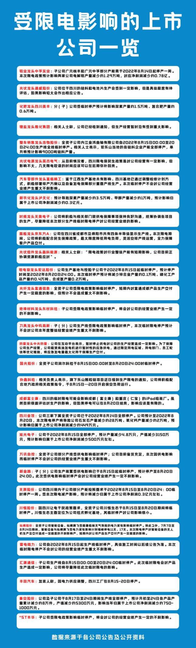 8月14日,四川省经信厅和国网四川联合下发了《关于扩大工业企业让电于民实施范围的紧急通知》,要求从8月15日起,四川省(除攀枝花、凉山)的19个市(州)扩大工业企业让电于民实施范围;对四川电网有序用电方案中所有工业电力用户(含白名单重点保障企业)实施生产全停(保安负荷除外)。原本预计限电持续的时间为8月15日至20日,但现实情况是,截至8月底仍有多个企业仍受限电影响。