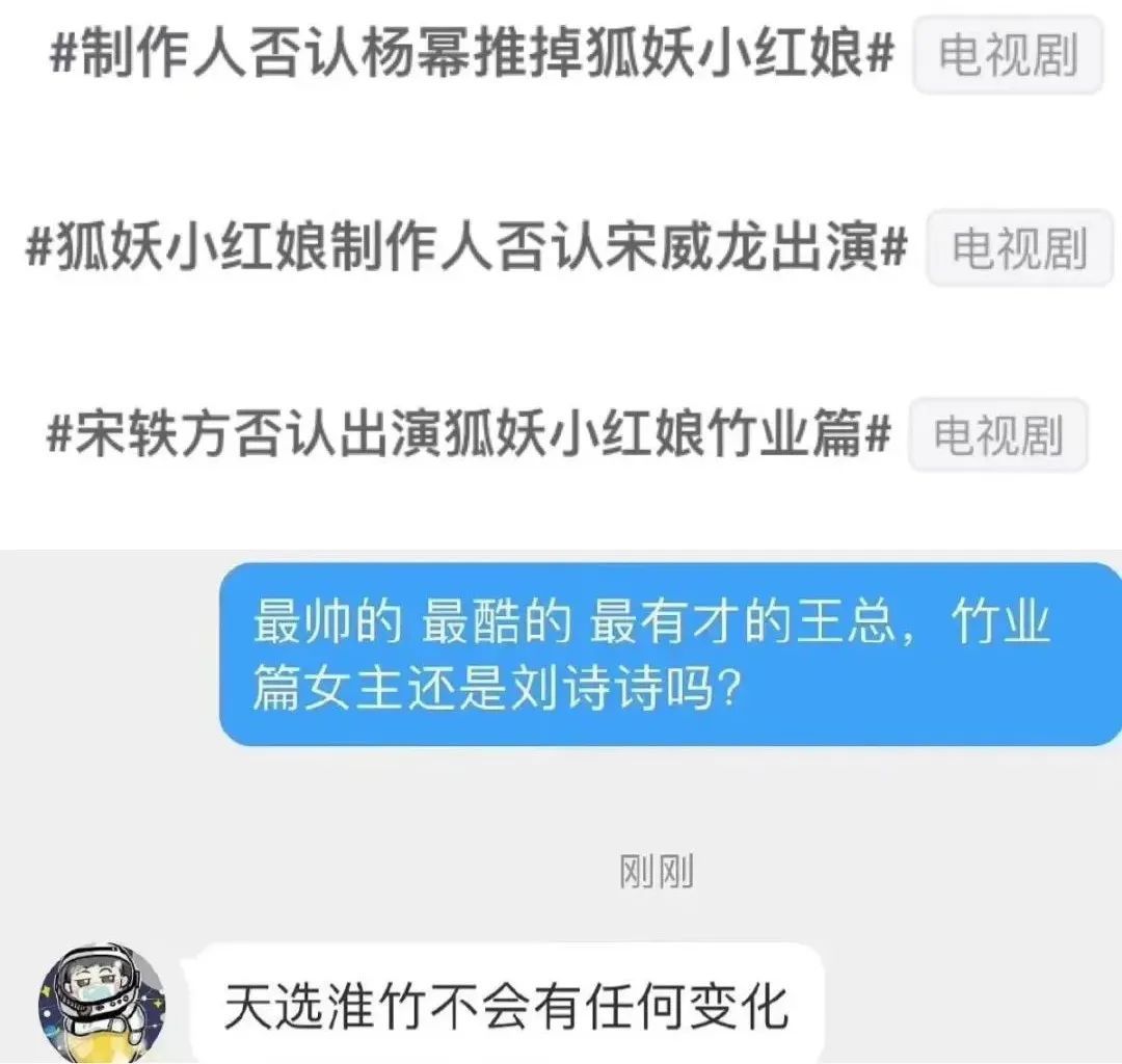 其后杨幂、龚俊进组《狐妖小红娘月红篇》,本以为就此尘埃落定。谁知关于刘诗诗出演的传闻还在继续,王一栩回复网友私信称天选淮竹不会有任何变化。虽然没有指名道姓,但被很多粉丝盖章定论刘诗诗仍会出演《狐妖小红娘竹业篇》。