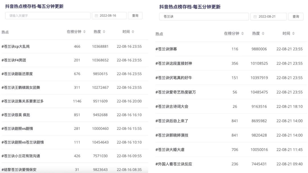 抖音热榜的差距更是悬殊。《苍兰诀》从播出第二天,就“常驻”热榜,平均每天5个热榜话题,最多一天多达10个热榜话题。而《星汉灿烂》一个热榜也没上过。《沉香如屑》虽然几乎每天都有上榜,但数量不多,1-4个,而且并非都是正面话题。