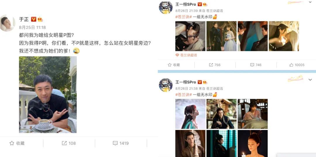 一个剧集项目,从开拍到播出,他不间断地发布各种各样无水印现场拍摄照片,并不断给转发照片的粉丝抽奖,还经常转发粉丝的二创视频、漫画图等等。除了《苍兰诀》,还未播出的杨超越、丁禹兮主演的《七时吉祥》二创,也在被王一栩疯狂转载。
