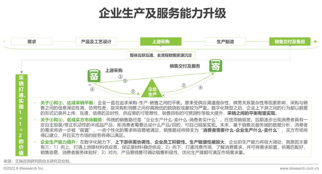企业从研发设计到销售服务全流程实现数字化是数字化转型升级的直接结果。其中,各环节数字化落地及打通后,对采购、销售环节的直接好处主要有四方面:1)通过数字化提升信息互通的及时性、供应商的可管理性、销售目标的可预测性、采购时间节点的可控性等方面,进而达成企业采销平衡;2)“消费者需要什么-企业生产什么-卖什么”的买方市场将得以建立,并且有望满足买方市场需求;3)数字化将促进企业上下游供需协调性、企业员工积极性、生产敏捷性等方面的提升,企业的生产能力上限有望提升。