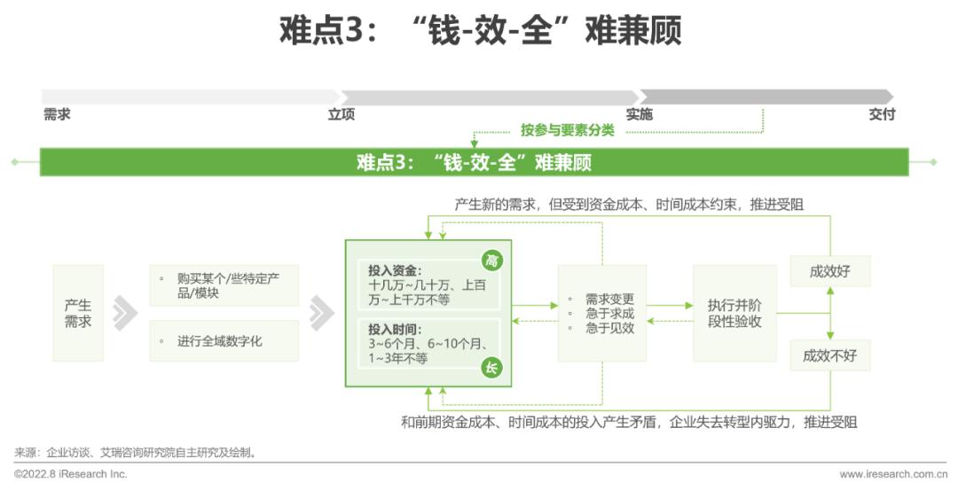 企业进行数字化转型的心态往往有以下几类:1)对于刚需性不强的企业,面对转型的不确定性,企业希望投入最少的成本来试错,后期如果有效就再逐步铺设。2)对于刚需性强的企业,往往以单个或多个模块化展开,此时涉及资金基本上以百万量级算,执行周期至少3个月起,具有费用高、周期长的特点。在这种背景下,发起人往往面临着“需求变更、怎么还没有完成、怎么还没有明显效果、怎么跟领导交代、钱花的值不值”等多种“拷问”,伴随而来的就会出现供需双方就“需求vs成本vs时间、时间vs成果vs效果、成本vs效果”等多种问题进行拉锯,这种内在、重复的阻力造成转型难。