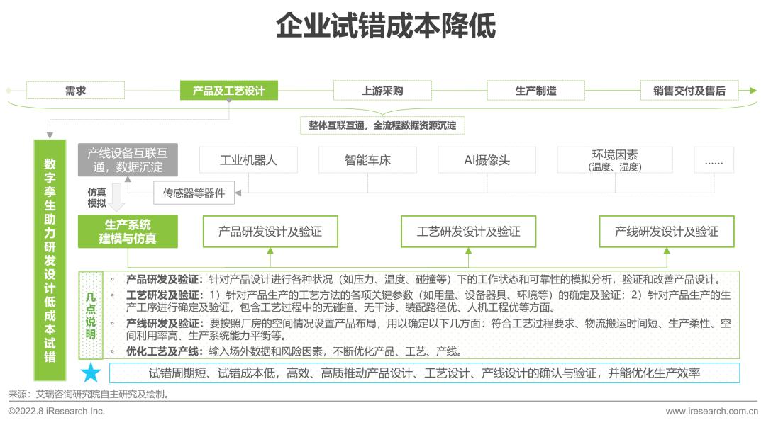 企业经过数字化改造后,为产品及工艺设计环节带来的直接价值就是降低试错成本和周期。具体而言,通过传感器等器件收集并沉淀产线相关数据,通过生产系统建模与仿真后,可对产品、工艺、产线进行仿真模拟,进而确认关键的产品参数、工艺参数、产线参数等。与此同时,通过输入场外数据,还能不断优化产品、工艺、产线,提升企业研发及生产效率、产品质量。