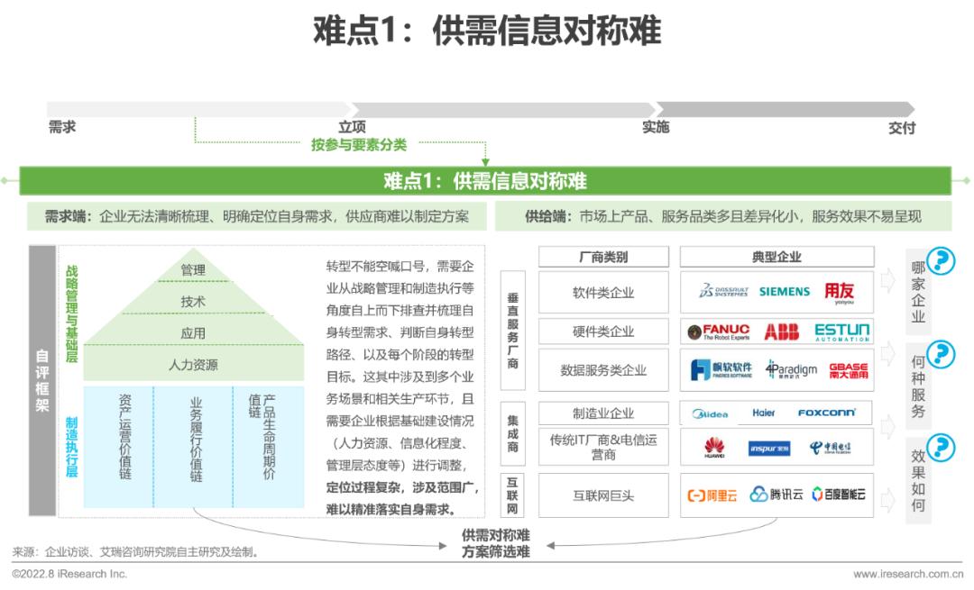 难点1:需求阶段:企业难以精确定位并传递转型需求,供应商难以直观给出效果,也难以体现差异化,双方信息不对称,方案选择困难