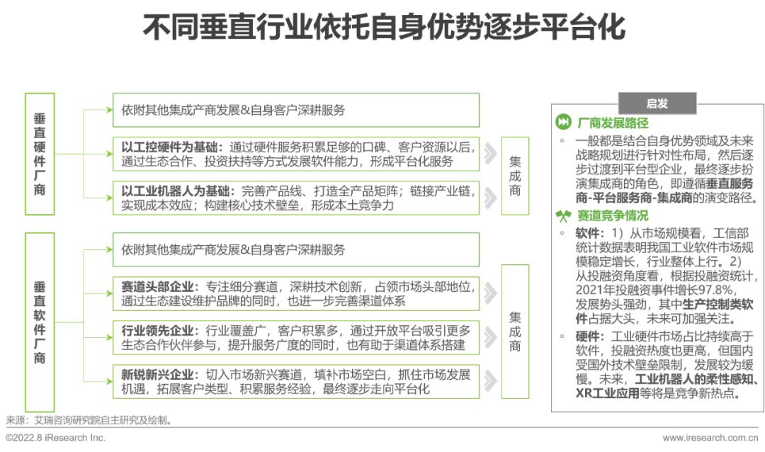 整体来看,硬件和软件的垂直厂商在经过一定的客户口碑、行业经验的积累后,会逐步走向以生态合作为主的平台化服务模式,最终企业可能会发展为集成商。以平台化服务模式过渡主要有两方面好处:其一,可在产品、技术等方面提升厂商的服务能力,可服务的客户类别、客户领域、客户需求等范围会变广;其二,积累足够的客户与服务经验后,企业的渠道体系雏形,为企业演变为集成商做准备。目前来看,垂直硬件厂商主要有工控硬件、工业机器人两大类;垂直软件厂商主要是赛道内头部、领先企业、行业新兴的新锐企业这三类。
