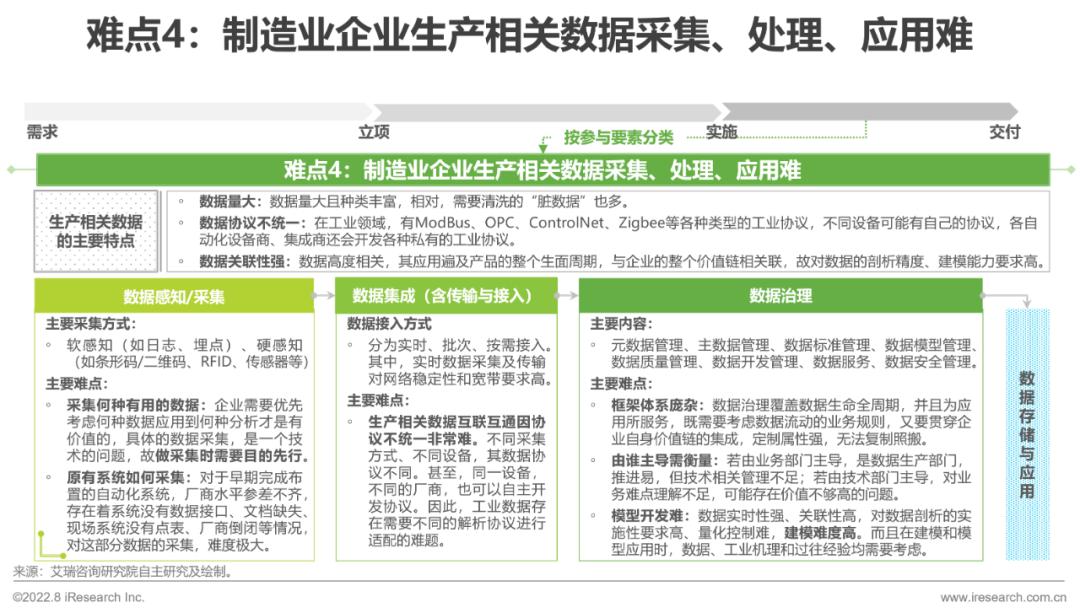 生产相关数据主要流转路径是:数据感知/采集-数据集成(包含传输与接入)-数据治理-数据存储与应用几个阶段。难点主要存在于前3个阶段:1)数据采集阶段:需要优先思考采集什么数据有用,然后就是针对老旧设备数据采集改造是否可行。2)数据集成阶段:存在不同采集途径、同一采集途径不同采集工具、同一类型工具不同厂商其数据协议不同的问题,数据互联互通难。3)数据治理阶段:生产相关数据的高实时性、强关联性对模型开发及应用要求高。