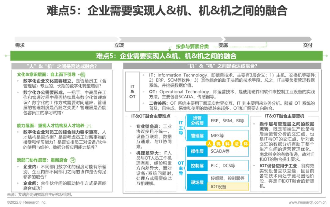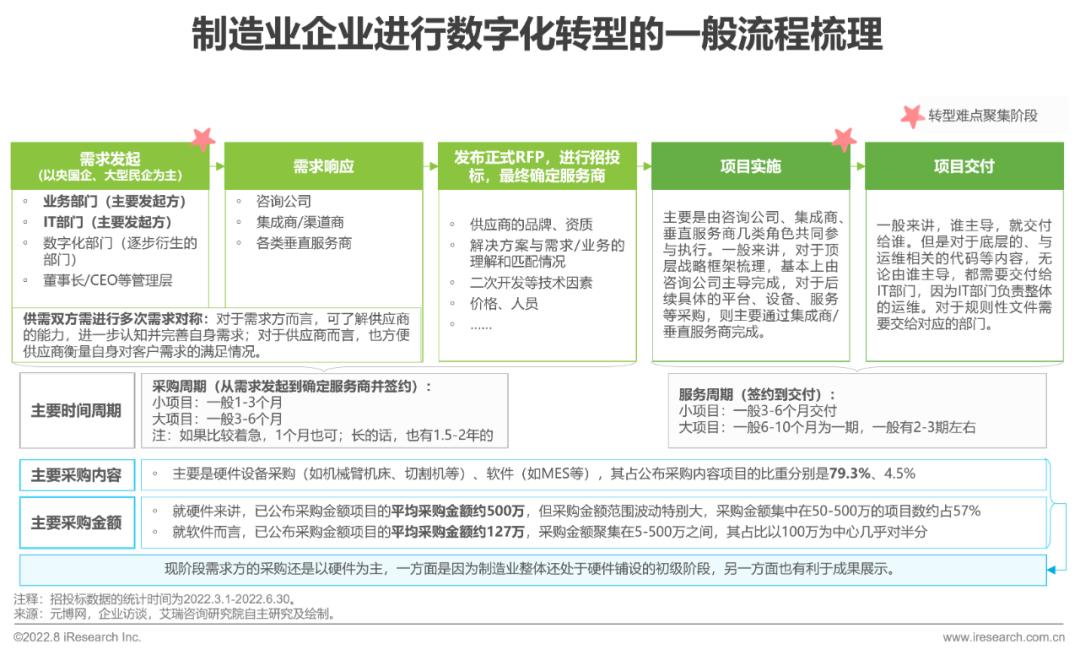 转型难点: 整体来看,难点可概括为自知难、推进难、落实难三点。针对自知难:1)在庞杂生产参与要素(设备、原材料、人员等)中梳理并明确自身需求难、定位清楚自己的数字化水平难;2)企业如何从诸多同质化的供应商中找到适合的合作对象难。针对推进难:1)制造业企业服务链条长,转型不是一个人或一个部门的事,破除部门墙难;2)转型具有金额高、周期长的特点,供需双方之间就需求变、急求成、急见效等问题会存在诸多拉锯,顺利推进难。针对落实难:1)制造业企业生产相关数据采集、应用难;2)培养并顺利过渡到数字化的工作方式难。