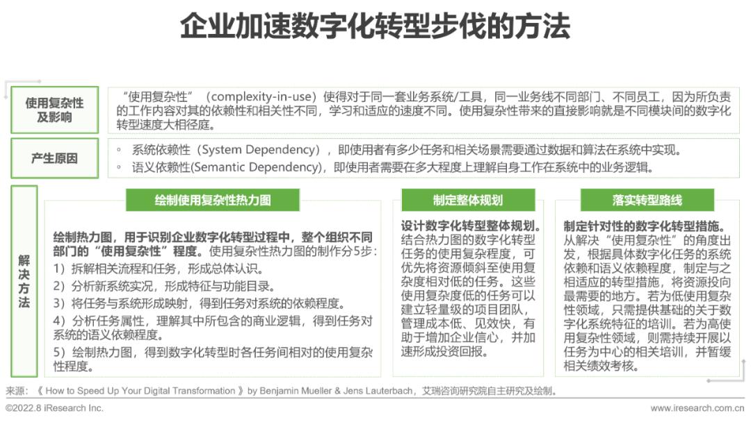 杰明·穆勒(Benjamin Mueller)教授与简斯·劳特巴赫通过系统依赖性和语义依赖性定义了“使用复杂性(complexity-in-use)”这一概念,并指出对系统依赖性和语义依赖性都具有较高要求的数字化转型工作任务将最为复杂和困难。可简单理解为:如果员工的工作需要通过数字化系统的能力(如数据、算法)完成,则系统依赖性越强;如果工作还需要员工去抽象理解其工作内容的业务逻辑如何在数字化系统中实现,则语义依赖性强。这两种依赖性不仅互为补充,还互相促进。如果系统依赖性升高,那么语义依赖性也会相应变大。针对使用复杂性,两位作者提出可通过“绘制使用复杂性热力图-制定整体数字化转型规划的计划-制定针对性的转型路线”的步骤来加速数字化转型的推进。