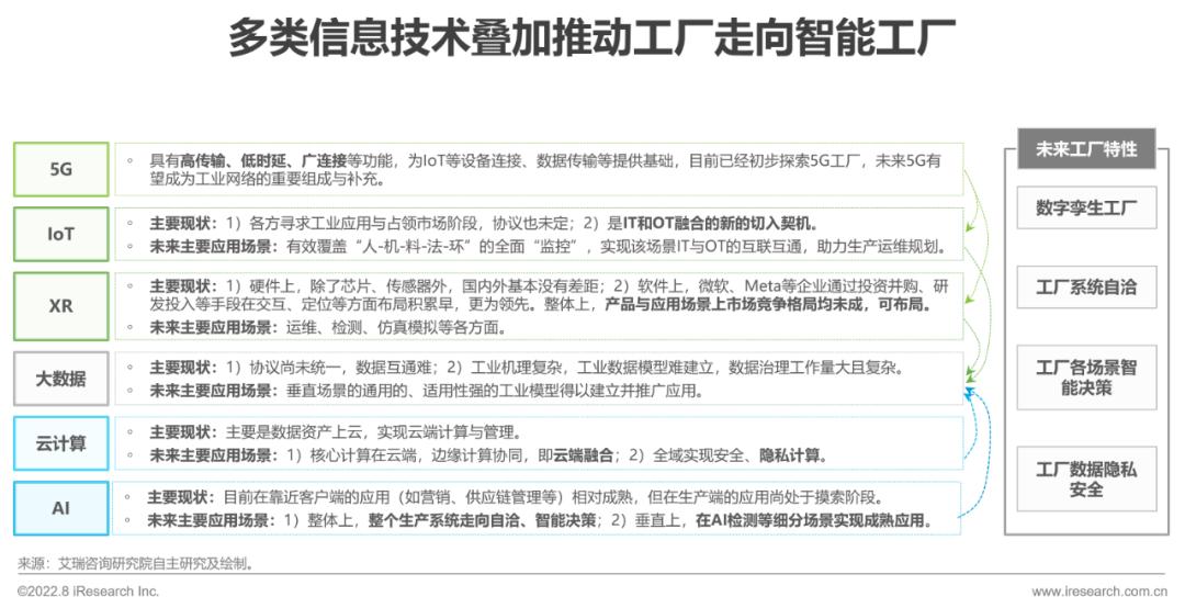 技术的发展为制造业的升级带来更多的可能性。随着信息技术的深入应用,智能工厂将逐步成为现实,具体表现在工厂系统整体实现自洽、工厂决策实现智能两方面。其中不同技术对智能工厂的促进作用表现为:5G促使工厂整体可连接设备增加、延时降低;IoT、XR等设备一方面可增强工厂监控覆盖面,另一方面可有效实现互联互通,促使IT与OT的融合;云计算和AI 则共同推动工厂积累的数据的高效分析与利用,达成整个工厂的“智能”。以上也说明:1)转型升级是多种技术叠加的效果,因为技术都是相辅相成的,单一技术的应用作用有限;2)需求方企业本身无需过渡追求某一单一的技术来实现转型,也不存在一技万能的技术助力企业实现转型。