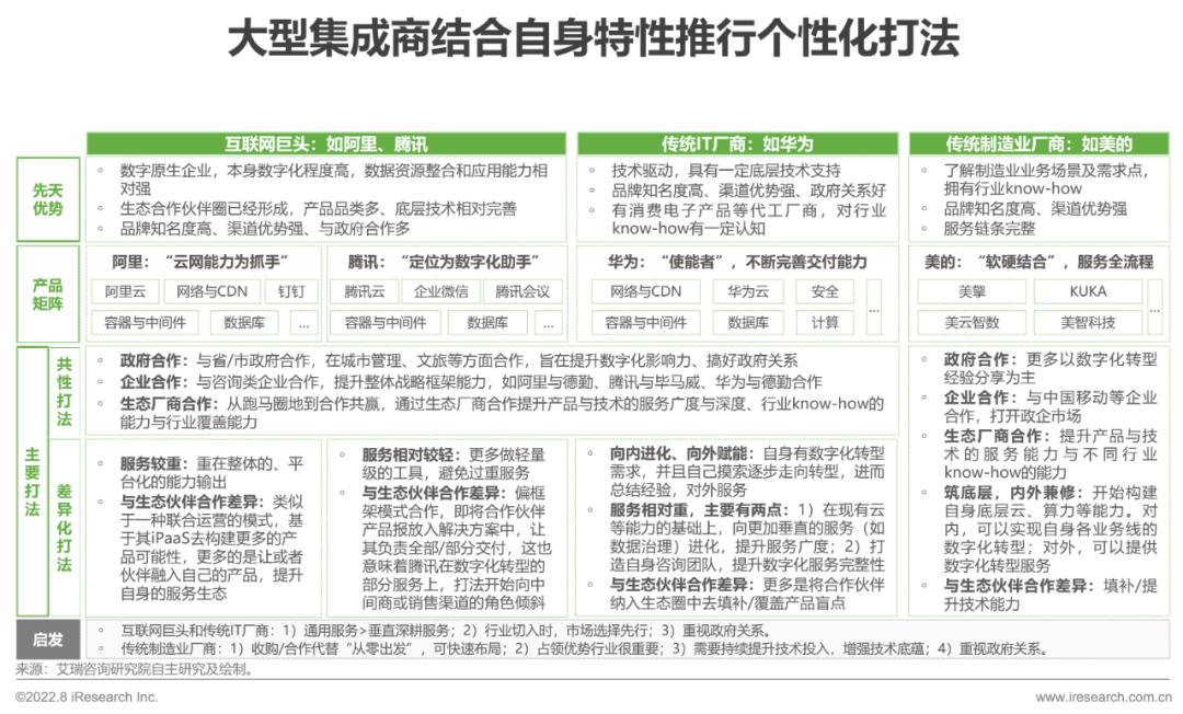 供给端: 1)对于主打集成商的大厂而言,要针对自身企业基因寻求合适的发展路径,初步来看,对于没有制造业经验的玩家,通用服务>垂直深耕服务用以开源,市场选择先行用以准确切入行业。对于有制造业经验的玩家,则收购/合作代替“从零出发”、占领自己所在行业、持续提升技术投入等是重点。但是,不管哪类企业,都需要重视政府关系。2)对于垂直类玩家而言,经过前期的客户积累、口碑建设后,往往通过生态合作伙伴的建立走向平台化服务,最终可能演变为集成商。