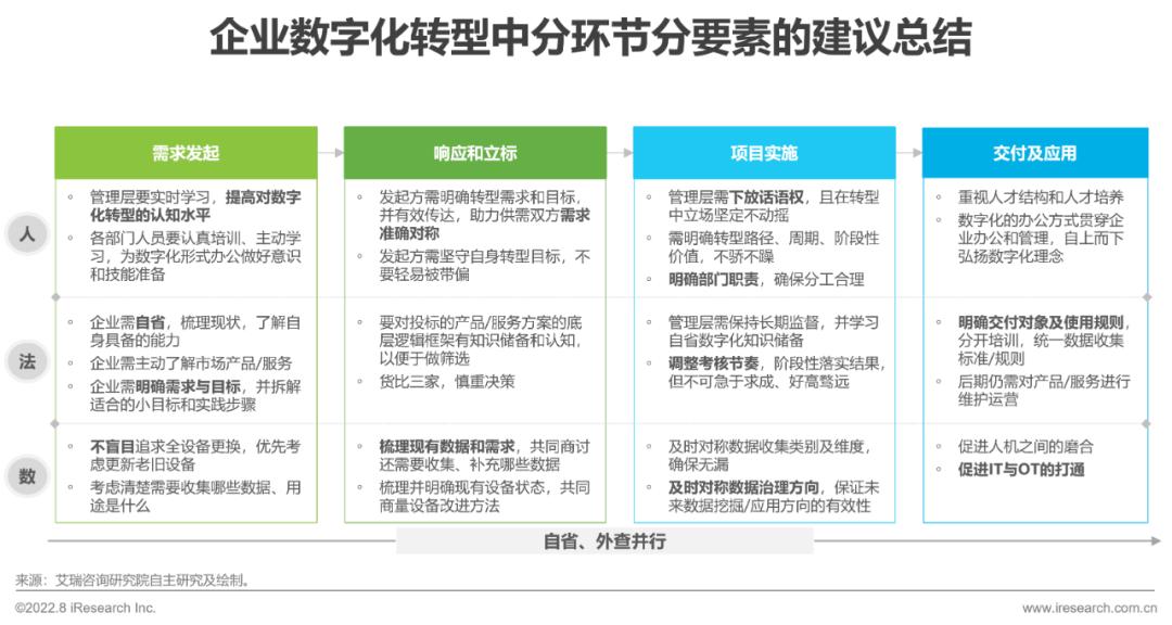 数字化转型不能是企业管理层拍脑袋的决策。由于其具有涉及内容复杂、成本高、周期长等特点,故必须从各个环节的各个参与要素上进行全面把控。从需求发起,到响应,再到实施和交付,从参与对象,到实施方法,再到数据收集与应用,企业都需做到自省+外查双线并行:对内,企业需要充分了解需求自身能力与诉求、明确转型目的和目标、协调分工、人才培养、最终落实并应用数字化的理念工作;对外,企业需要认知市场、了解产品/服务、有效需求对称及沟通、长期监督,并适当调整考核节奏及期望。