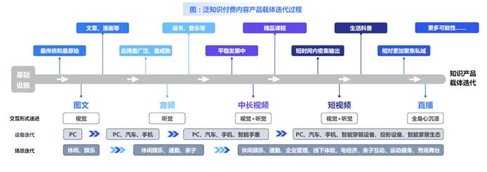 在此大范围下,提供的产品是“知识”,带有学习性质、能帮助消费者实现自我提升目的的内容消费,可以理解为知识付费。