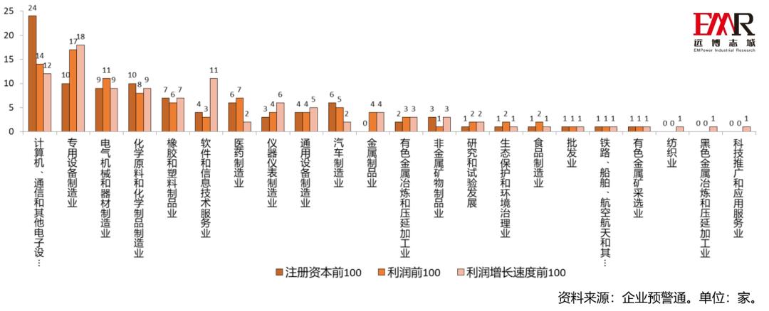 从上市企业的注册资本规模、盈利水平、成长速度三个维度来看,计算机、通信和其他电子设备制造业,专用设备制造业,电气机械和器材制造业的上市企业财务状况表现突出。 在财务状况前100名的上市企业中,以上3类行业的专精特新“小巨人”上市企业数量偏多。