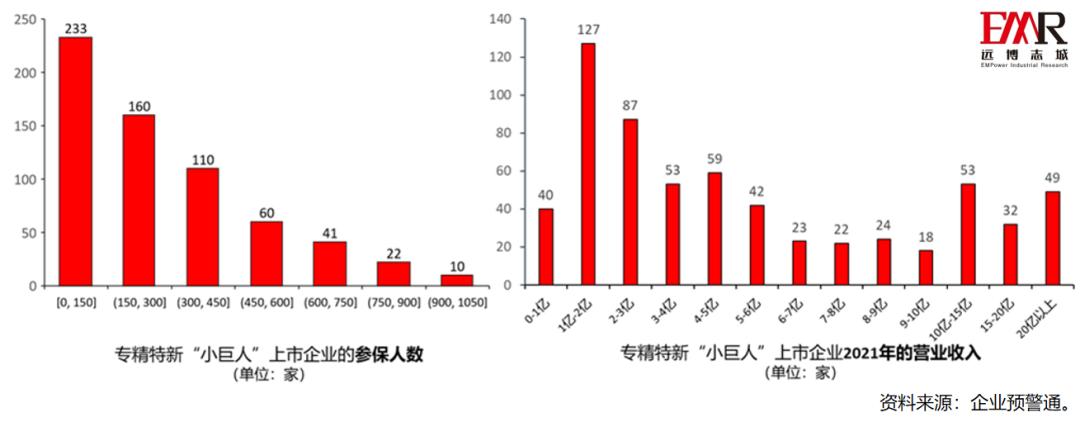 专精特新“小巨人”上市企业从业人数偏少,企业营业收入高。 在从业人数层面,专精特新“小巨人”上市企业的平均参保人数为287人,超过60%的上市企业从业人数小于300人。在企业营业收入层面,专精特新“小巨人”上市企业营业收入分布差异较大,其中营业收入在1-3亿内的企业偏多。值得注意的是,部分专精特新“小巨人”上市企业尽管从业人数不多,但在营业收入层面已经达到大型企业标准。