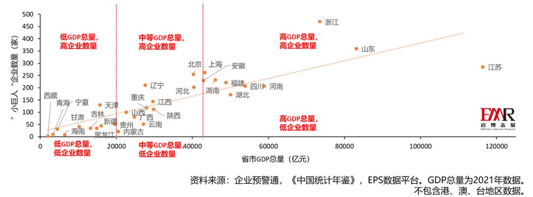 图9 中国各省小巨人数量与经济体量间的散点关系图