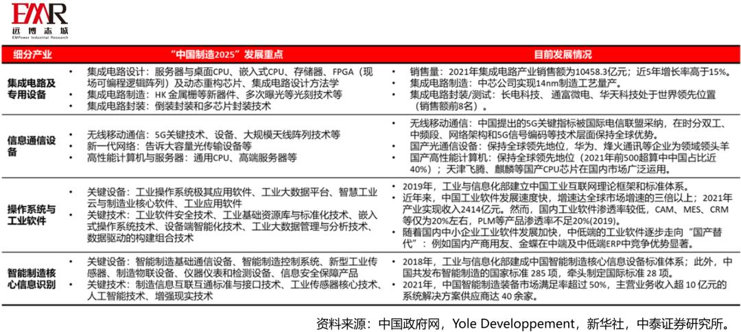 在新一代信息技术产业领域:中国信息通信设备行业处于国际领先地位,集成电路、操作系统和智能制造等行业发展相对薄弱。 《中国制造2025》将集成电路及专用设备、信息通信设备、操作系统与工业软件、智能制造核心信息设备四大细分行业列为新一代信息技术产业的重点发展领域。中国信息通信设备行业在5G关键技术、光通信设备和新一代计算机等领域率先出现了一批具有国际竞争力的代表性领军企业,如华为、天津飞腾、烽火通讯等。然而,在其余三个细分行业,国内大部分企业与国际行业巨头相比仍存在一定的差距,只能通过廉价的低端产品占据部分市场份额。