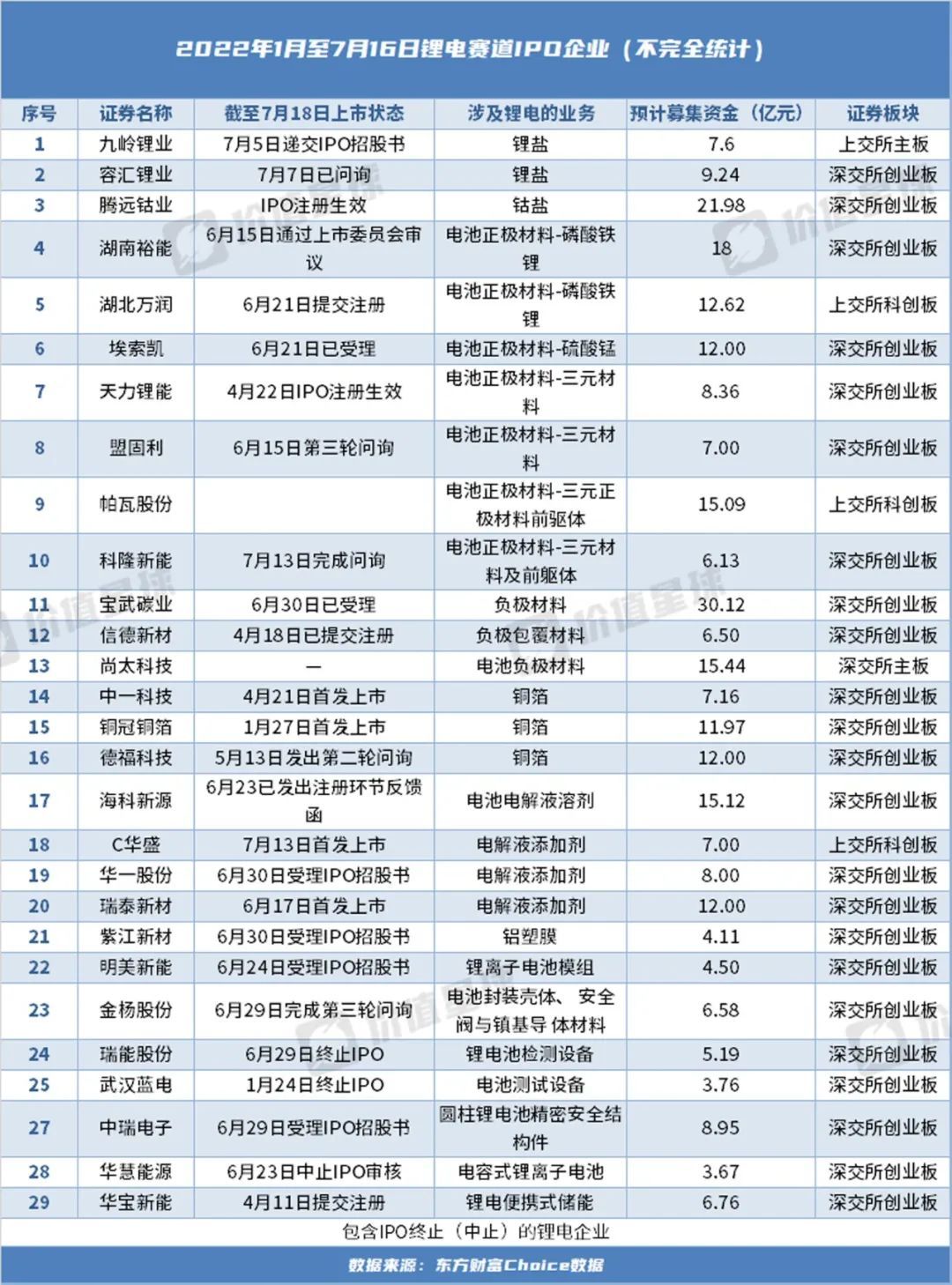在成功上市的6家企业中,有5家锂电企业都比预计募资更多。其中华盛锂电欲募集资金达7亿元,于7月4日完成募资达25.74亿元;铜冠铜箔计划募集资金为11.97亿元,实际募集资金35.79亿元,腾远钴业预计募集21.98亿元,实际上募集的资金接近55亿元。