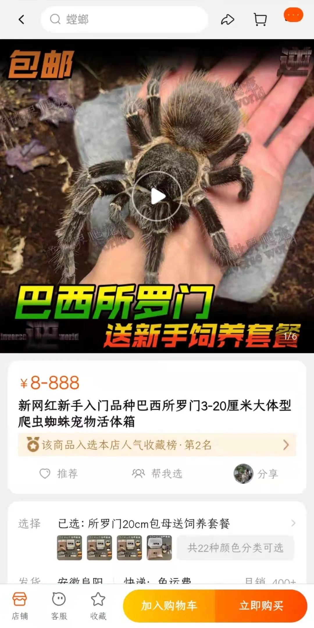 比如,在电商平台上,一只7到8厘米的巴西所罗门蜘蛛售价110元,同等大小母蜘蛛则为158元;马达加斯加发声蟑螂,一对公母成体可繁殖的蟑螂售价68元;含有微毒的一对身长18厘米左右的亚洲雨林蝎售价为145元。