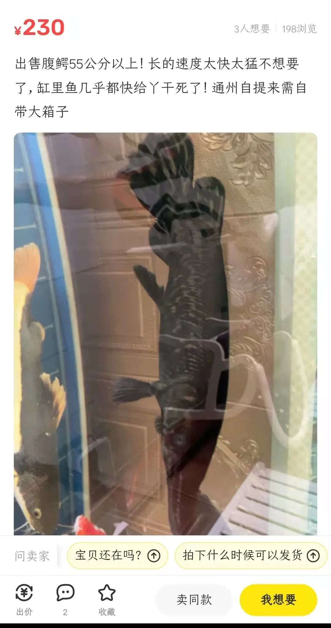 在二手交易平台上,也有部分因养殖条件不足,被转售的大型鳄雀鳝。有人挂出150元的价格,准备出售体长40厘米的鳄雀鳝,称“状态很好,皮毛漂亮,就是太厉害了没法养其他鱼”。也有人以230元出售一条55厘米的鳄雀鳝,称“长的速度太快太猛,不想要了”。