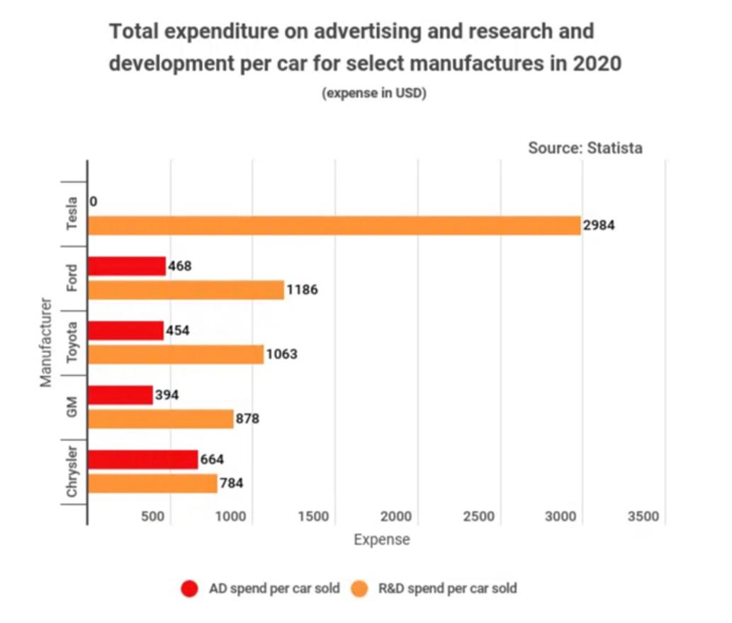根据stockApps在今年一季度发布的报告,特斯拉单辆汽车的研发费用约为2984美元,是行业平均水平的三倍有余,甚至高于福特、通用和克莱斯勒单辆汽车的研发费用之和,和“蔚小理”自然也不在同一水平线上。