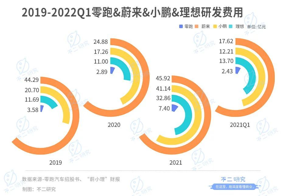 而据“蔚小理”财报显示,2019-2021年及2022年一季度,蔚来汽车为44.29亿、24.88亿、45.92亿和17.62亿;小鹏汽车为20.70亿、17.26亿、41.14亿和12.21亿;理想汽车研发费用分别是11.69亿、11.00亿、32.86亿和13.70亿。