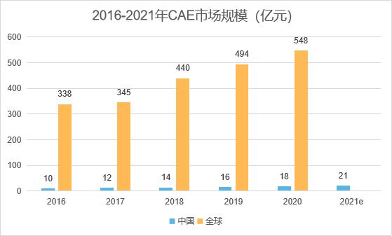 (1)CAE软件市场规模较小,2020年全球CAE市场规模为548亿元,据国际咨询机构GrandView Research测算,未来十年全球CAE市场CAGR超9%,中国接近18%。
