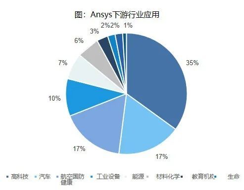 以Ansys下游行业应用为例,主要应用于高科技、汽车、航空国防、工业设备、能源、材料化学、教育机构等领域。