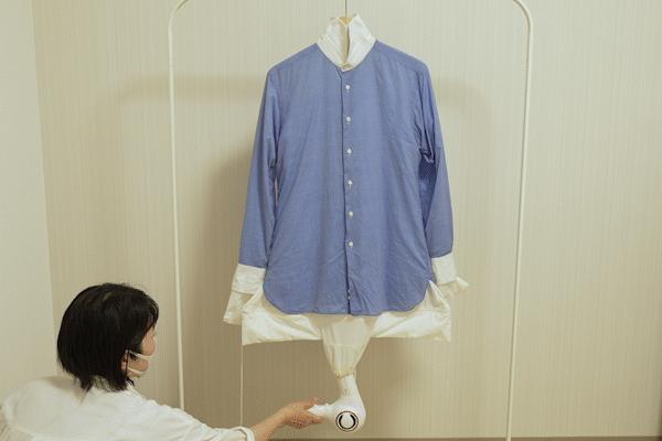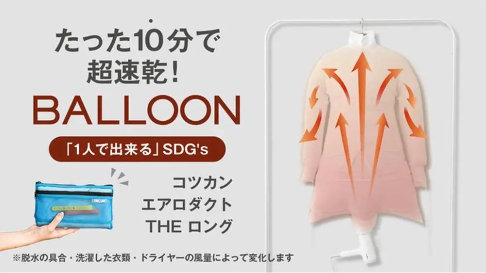 将衣服套在气球外面,用吹风机插进气球下方的风口,最快 10 分钟就可以吹干一件普通 T 恤。