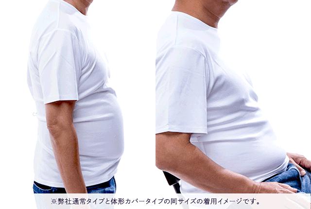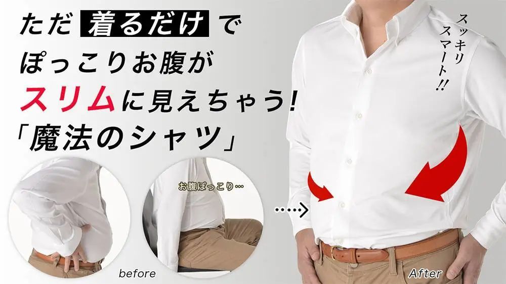 原来,这款 T 恤暗藏魔法——在对比照里,大肚便便的中年男人穿上「Visi T」,肚子竟然神奇地不见了。