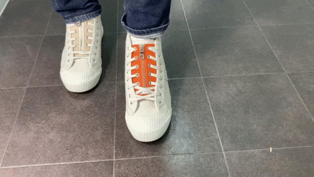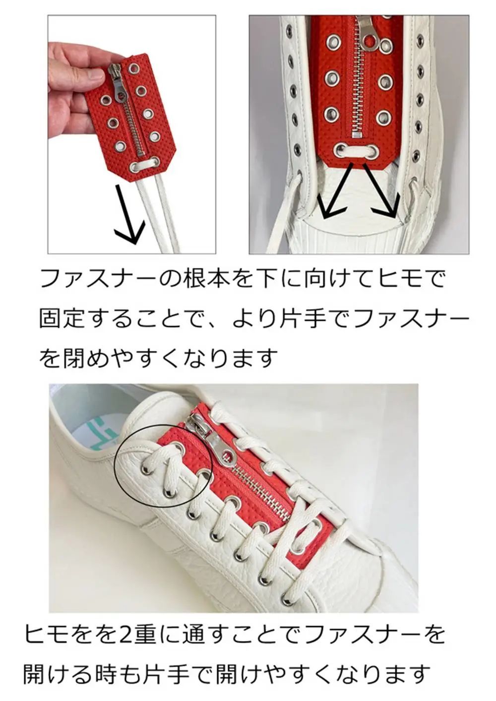 只要将鞋带分别穿过拉链片两边孔洞系紧,之后每次只要拉上拉链就穿好运动鞋了。