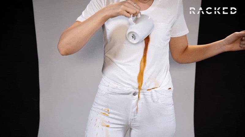 这个时候如果穿的是白 T,即使很小心也很难幸免于难,只能带着尴尬的污渍,浑身不舒服地走出餐厅。