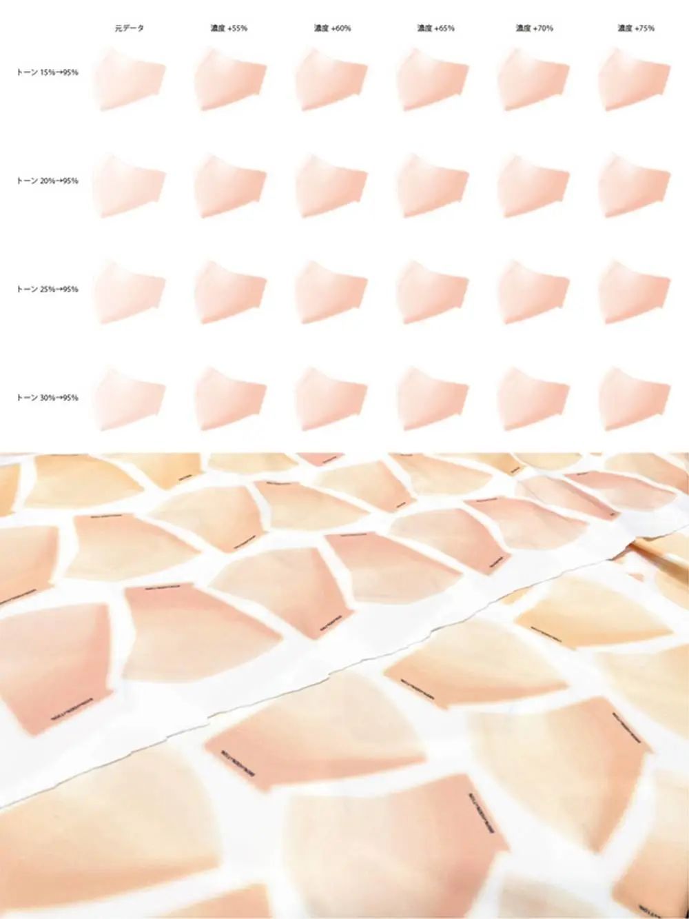 专业化妆师和颜色专家都加入了开发团队,耗费了 4 个月研究如何将显脸小的立体妆容印到口罩上——只需带上口罩,就可以打造出化了「小脸妆」的视觉效果。