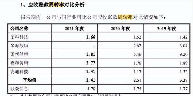 并且,同期内国新健康 、嘉和美康、琴海数码等行业应收账款周转率均值为3.37、2.51、2.41,而联众网络的应收账款周转率则为1.77、1.75、1.7,低于行业均值。