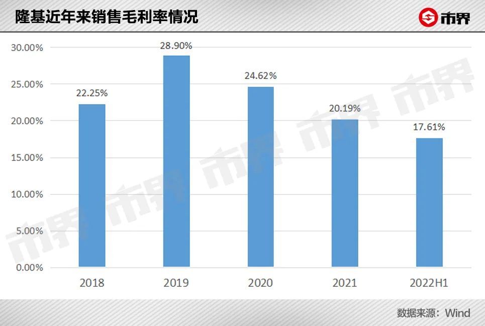 隆基财报中已经显露隐患。近两年, 隆基的销售毛利率连续下滑。 从2019年的28.9%,缩减至2021年的20.19%。2022年上半年,又进一步缩减至17.61%。