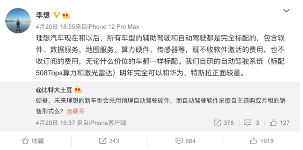 又如增程式技术已经很成熟,研发上自然不用像纯电那样烧钱,2021年,蔚来和小鹏的研发投入都超过40亿元,理想是30亿元出头。在阐述智能驾驶的收费模式上,蔚来、小鹏,包括特斯拉都是买断或者订阅的模式,只有李想认为这是车的标配,应该免费。