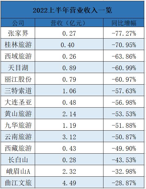 财报数据显示,14家景区类上市公司,无一例外,营收全部下跌,而且跌幅还不小。营收下降最多的张家界,上半年营收仅有0.26亿元,跌幅达到77.27%;营收下降最少的曲江文旅,上半年营收为4.49亿元,跌幅也有28.87%。