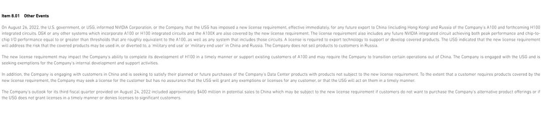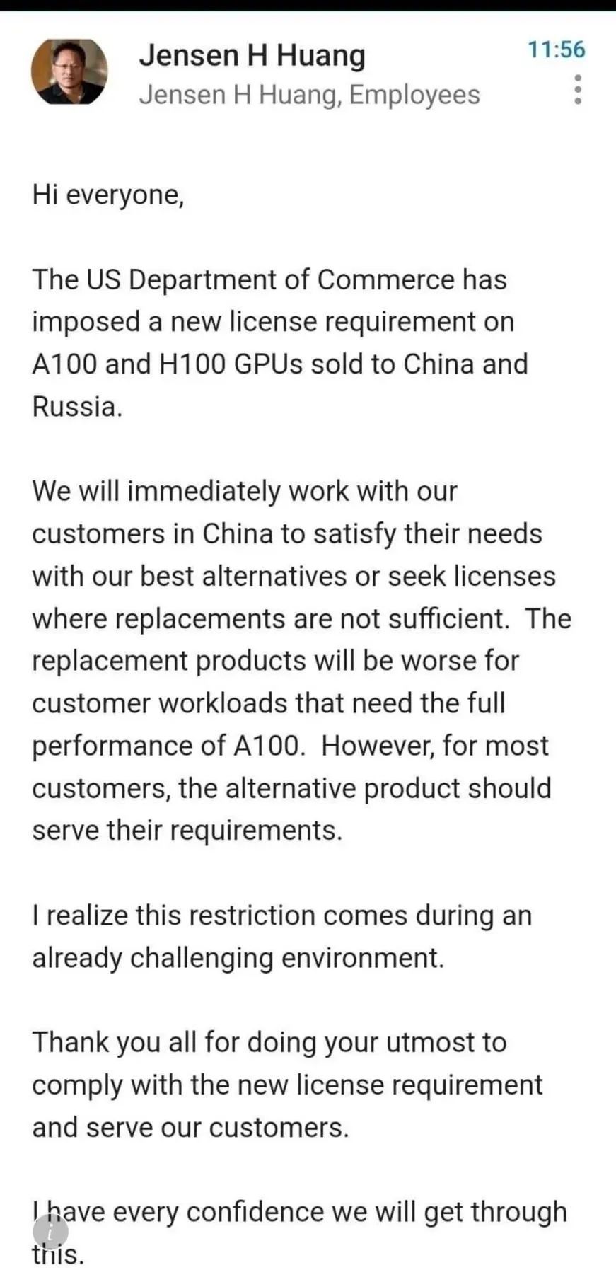 暂停对中国区所有客户所有代理商的数据中心GPU卡A100和H100的发货,其它GPU卡不受影响;各服务器OEM的现有库存A100 GPU卡,目前可以对各自的行业客户继续交付,NVIDIA中国区目前也没有对 OEM发任何 Letter ;NVIDIA总部还在分析美国政府的政策要求,预计还需要2-3天才会有对中国区客户与合作伙伴的沟通口径。