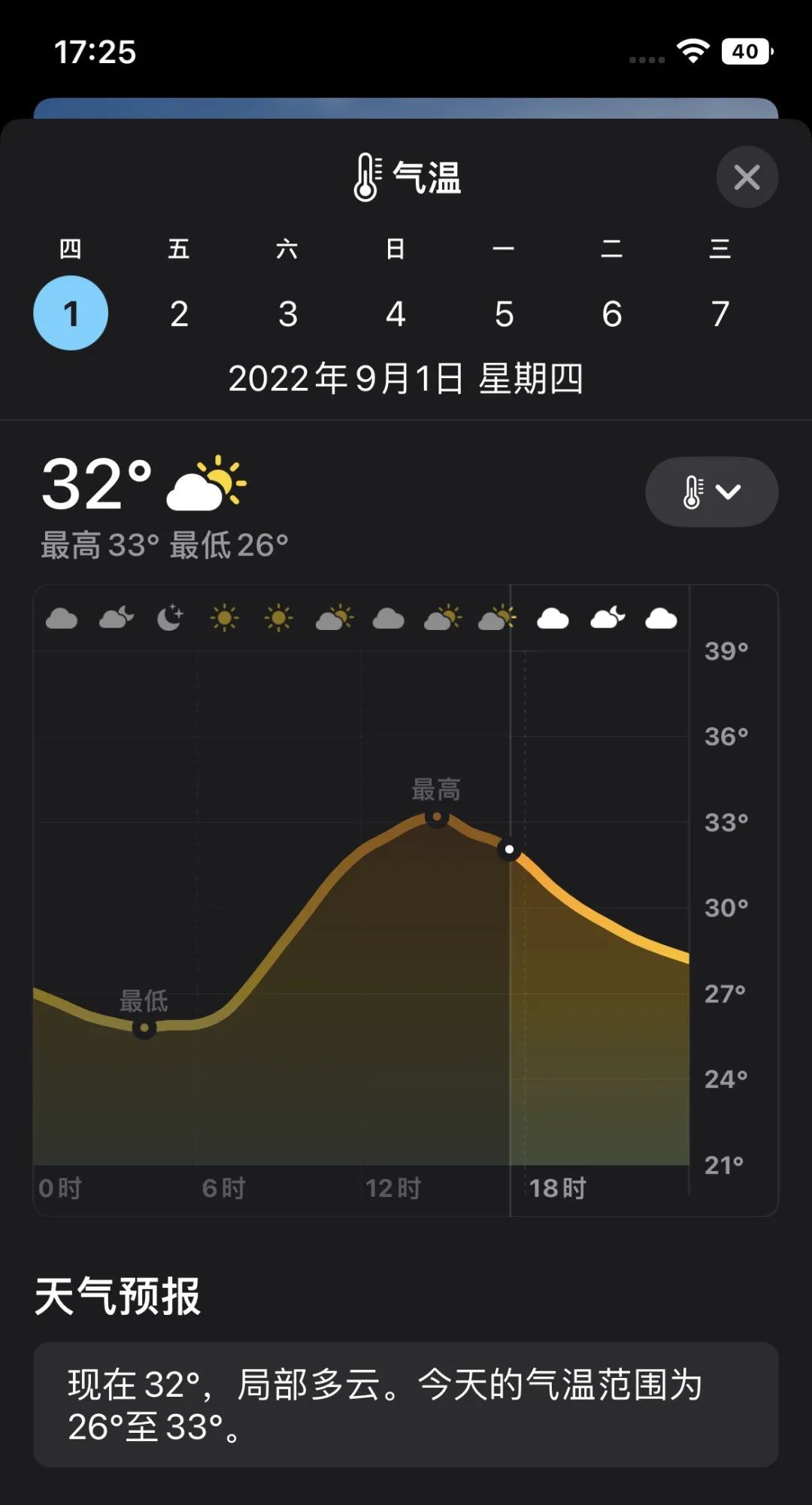 在比如小模块十日天气预报中只能查看一天的最低温和最高温,但 iOS16 可以点进去来查看温度在具体时间的起伏变化。