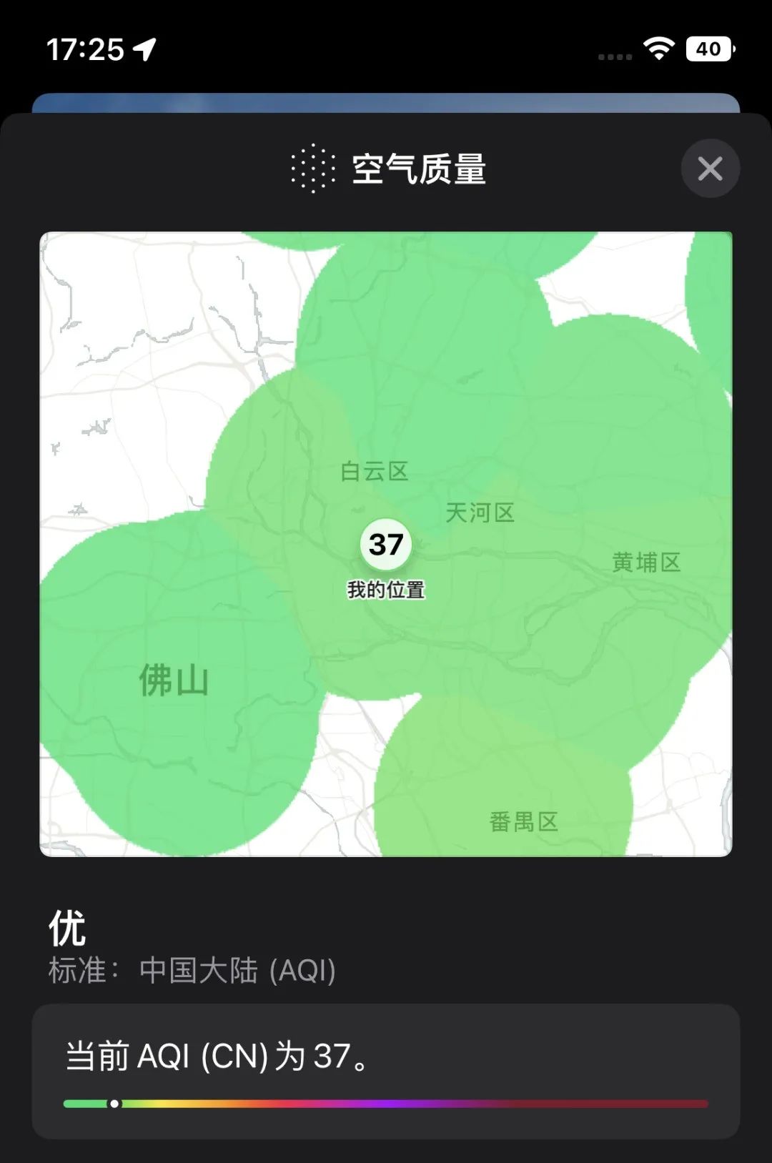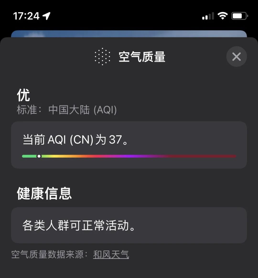 在 iOS 端上,天气 APP 虽然没有进行特别大的设计改革,但现在可以呈现更多信息了。比如 iOS15 上的空气质量模块只能呈现信息文字、而 iOS16 上的可视化图更加直观明了。