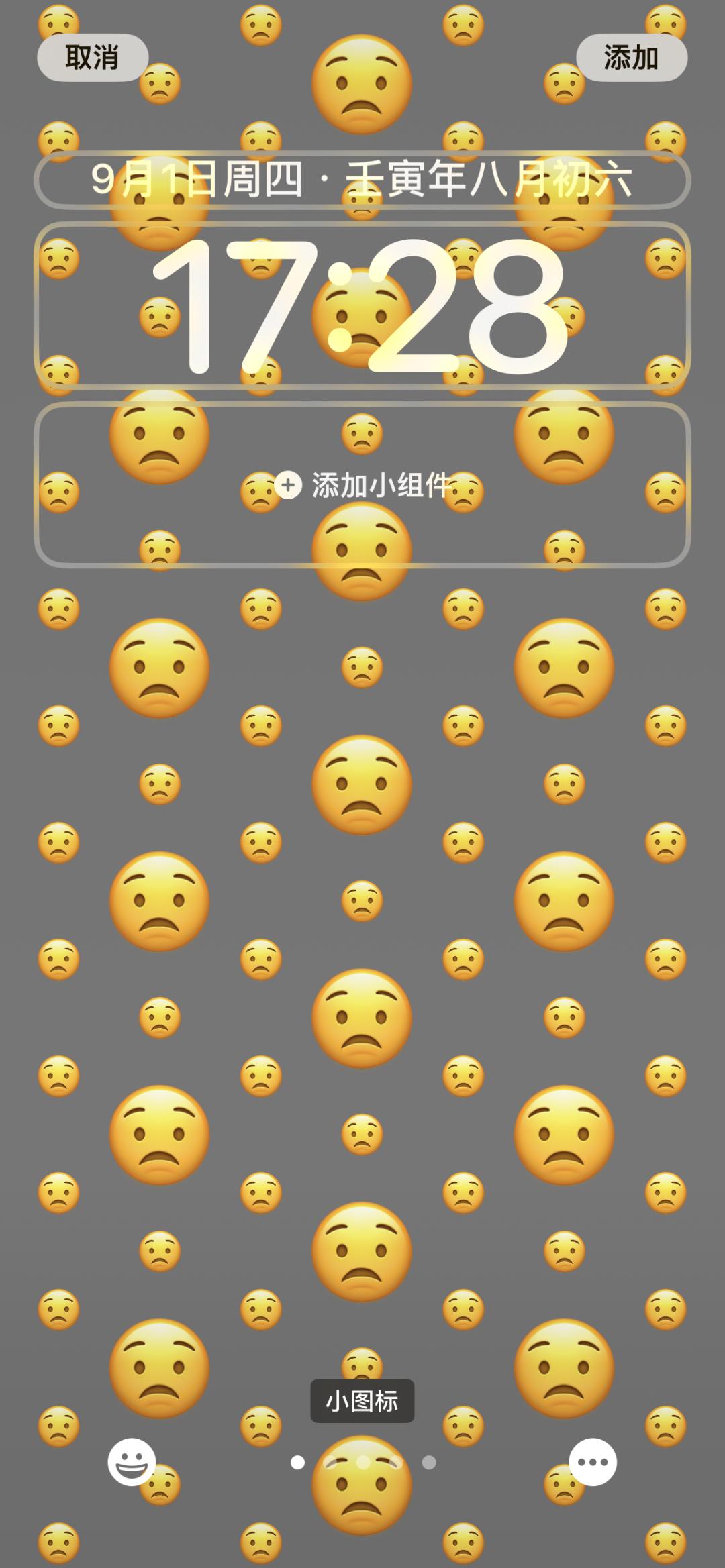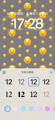 在壁纸方面,除传统照片外,iOS16 也提供了表情符号、天气、天文(天气和天文这两种动态壁纸,会根据你的定位和时间,实时变化锁屏的内容)、颜色等类型选择,比如果子就会选择这个 emo 的表情壁纸。