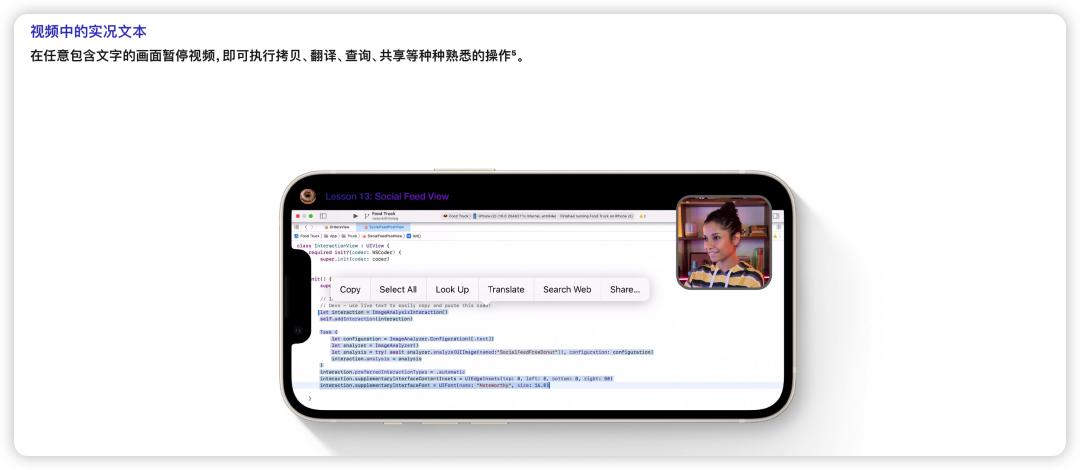 而到了 iOS16,实况文本不在局限于照片,而是支持在任意包含文字的画面中暂停视频,即可执行拷贝、翻译、查询、共享等操作,并且适用于照片、快速查看、Safari 和其他应用程序多种场景。