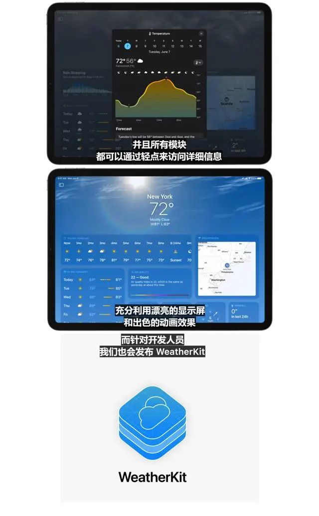 还有空气质量、降水、紫外线指数、日落 / 日出时间、风、湿度、感官温度、能见度和压力等就不一一例举。一句话总结就是可呈现的信息更多且更直观。