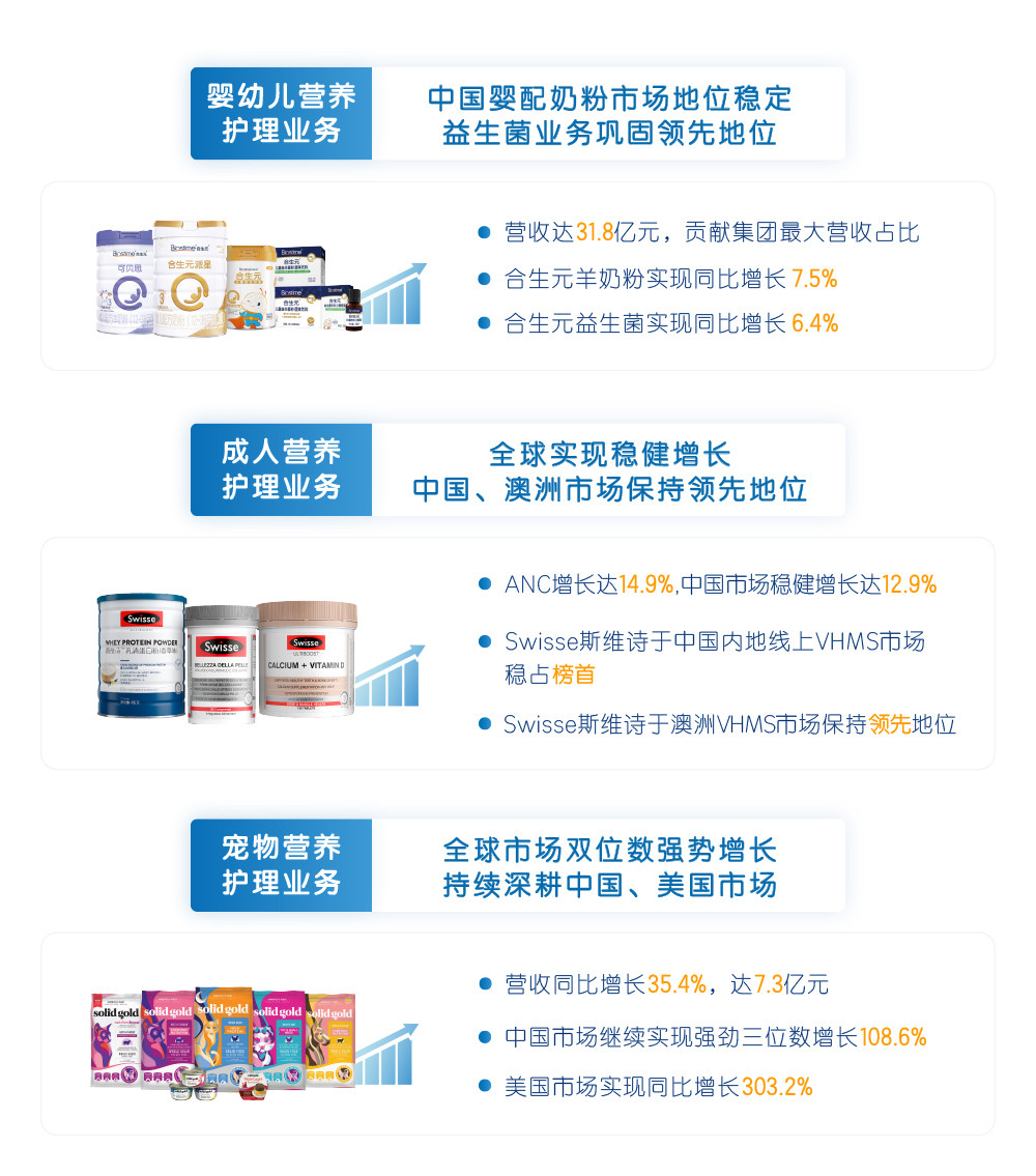 健合集团的核心业务分别是婴幼儿营养与护理业务单元(BNC)、成人营养与护理业务单元(ANC)和宠物营养与护理业务单元(PNC)。其最新半年发布的财报显示,这三大业务占营收比重分别为53.4%、34.4%和12.2%。
