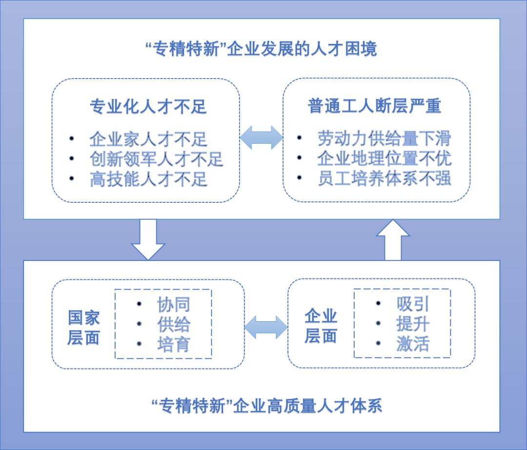 “专精特新”即“专业化、精细化、特色化、新颖化”,“专精特新”企业即具备“专业化、精细化、特色化、新颖化”特征的企业。中小企业是国民经济和社会发展的生力军,在稳增长、促改革、调结构、惠民生、防风险中发挥着重要作用。我国中小企业的数量不断壮大,2019年占全国企业总数的99.8%。中小企业贡献了全国50%以上的税收、60%以上的GDP、70%以上的技术创新成果和80%以上的劳动力就业。在经济社会高质量发展的新时代战略要求下,引导中小企业走“专精特新”的发展道路,是可行的途径和重要的抓手。然而,对于“专精特新”企业而言,人才与资金的困境是其发展过程中普遍面临的问题。其中,人才困境表现为两种类型,一是专业化人才不足,二是普通工人断层严重。