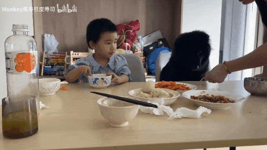 UP主@Monkey酱与豆皮寿司家的大黑狗皮皮,就是冷风宇宙的一员,如今它已经和小主人打成了一片,关系好到在一张桌上吃饭。