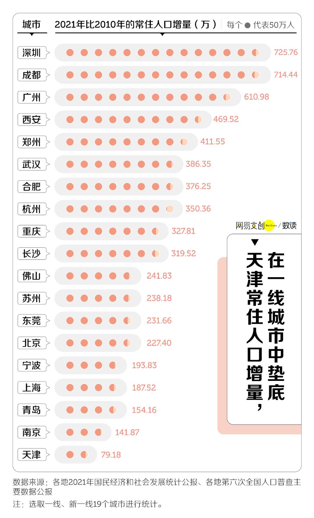 在 19 个一线和新一线城市里,天津在十一年间的人口增量仅有 79.18 万,排名末位。这些增加的人口中,或许还包括一些“户口在津、人在京”的北漂。