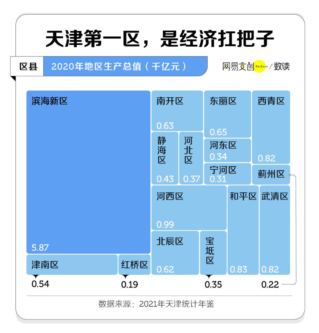 2020 年,滨海新区的经济体量占据天津的 42%,在 16 个区县中一骑绝尘,也难怪一直有着“滨海兴天津兴”的说法 [11]。