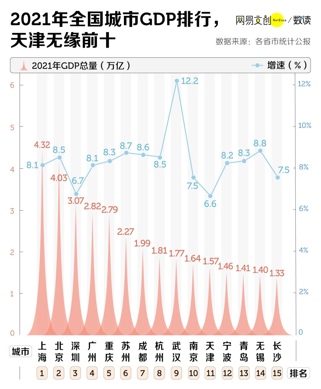 按照 2021 年的 GDP 来算,天津以 1.57 万亿元位列第十一。虽说守住了北方第二的地位,但再度无缘全国十强,6.6% 的增速也是前十五名中最低的一位。