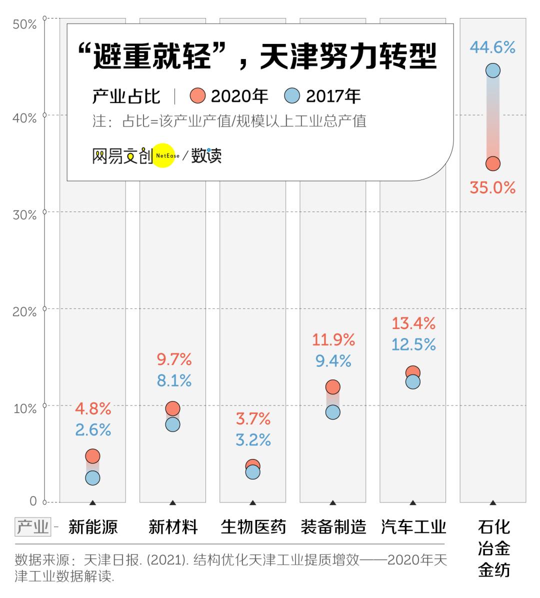 2018 年,天津一口气关停和整改了 314 个工业园,致力于发展高技术制造业和战略性新兴产业,石化、冶金和金纺等三大传统产业的占比下降至 2020 年的 35% [14]。