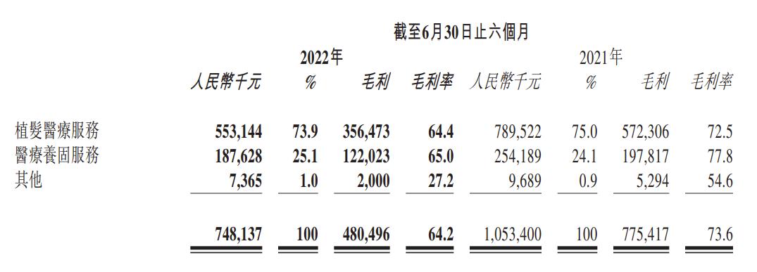结合此前招股书,雍禾每植一次发,平均收入2.7万元。从2018年到2021年,其毛利率长期保持在70%以上,2020年甚至达到75%。而今年上半年,这项“引以为傲”的指标跌至64.2%,同比下跌近10%,为近年来最低。